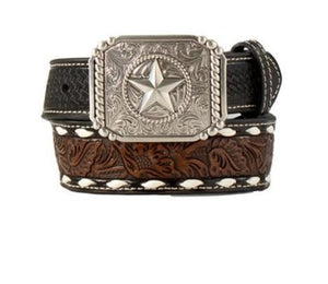 Complete your look with this boy’s 3D belt from M&F Western. This tapered leather belt has a basketweave embossed billets and the body is floral embossed with white twisted buck lace stitching. It is finished with a rectangle buckle that has an engraved, raised star with an engraved scrolling background. Tapered from 1 1/2” to 1 ¼”. 3D Style Number D1200041107.