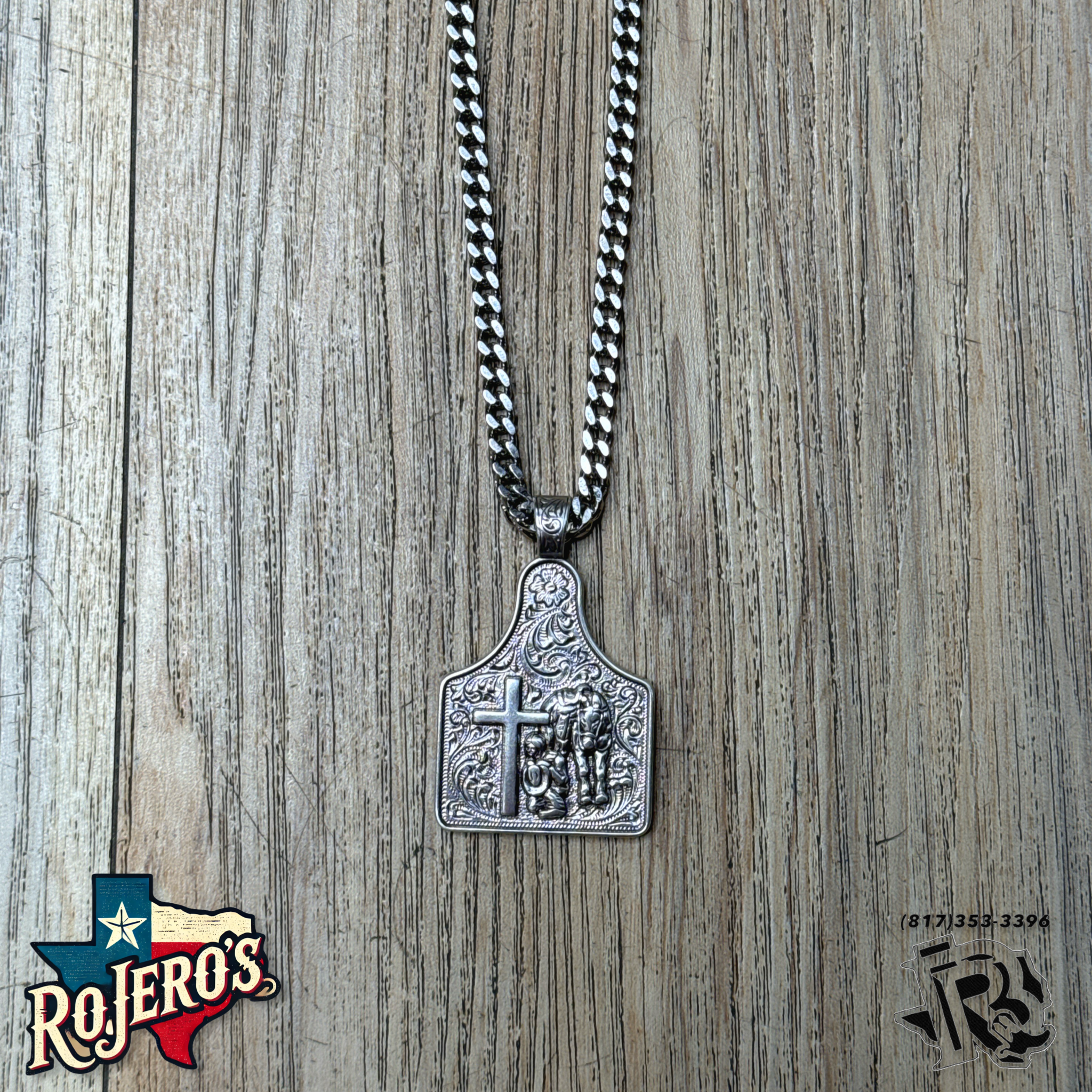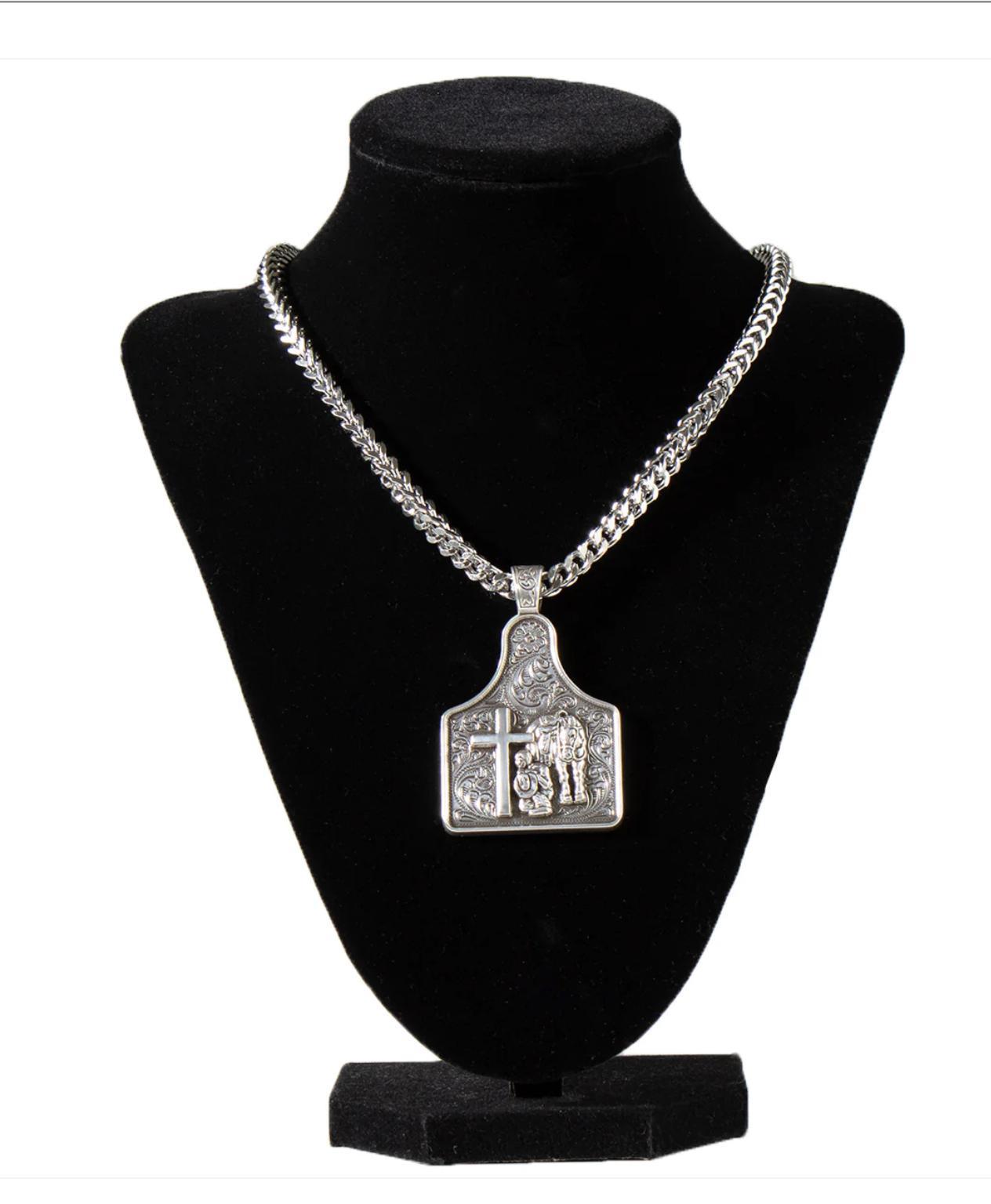 Men’s Twister necklace by M&F Western Products. Pendant has a praying cowboy motif with an engraved floral background around it. Beautifully hanging on a silver 24 inch chain.