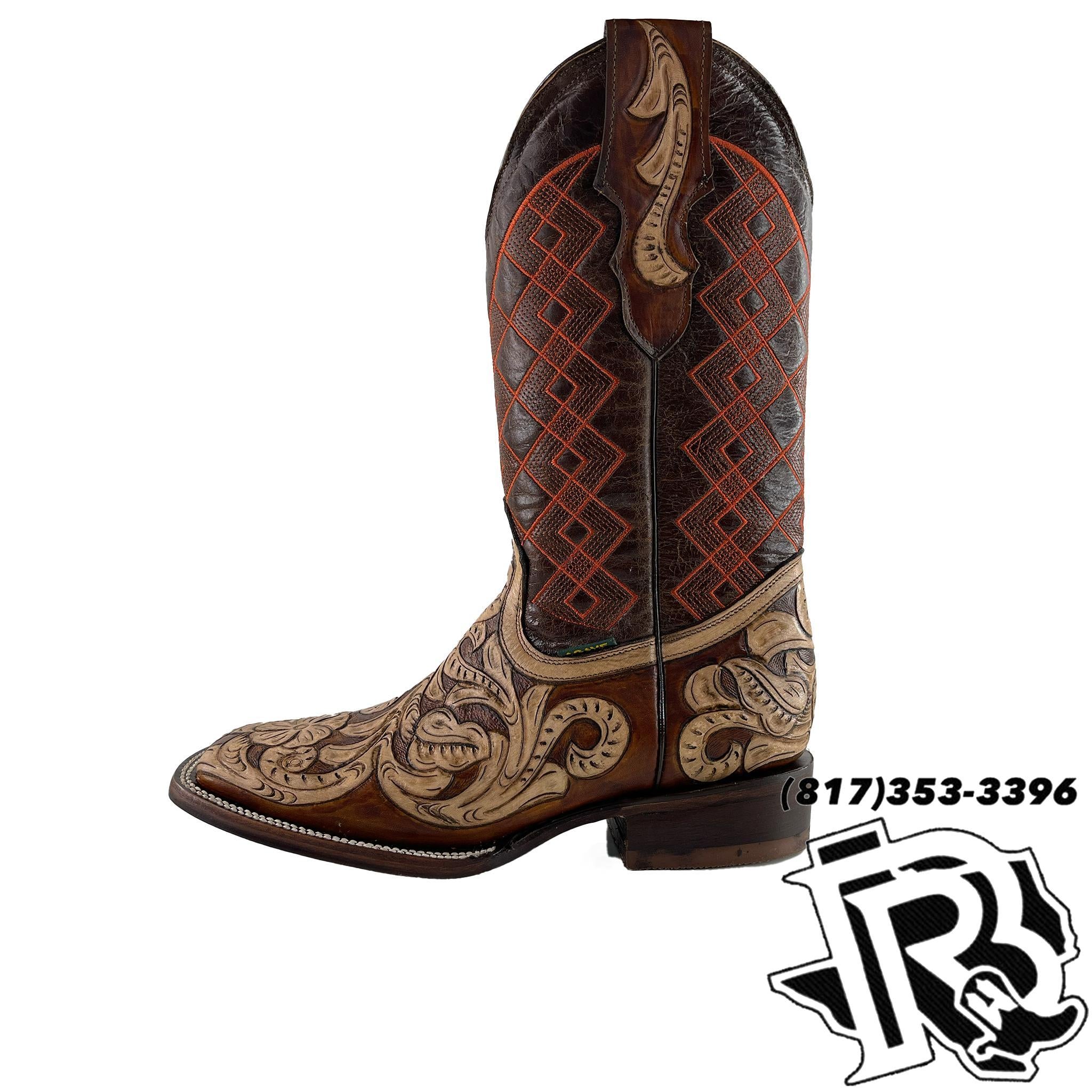 BR BOOTS : Tooled leather natural SQUARE TOE BOOTS