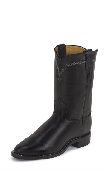 The Brock Roper Black is a 10-inch tall Men's roper boot that exudes simplicity and refinement. Its classic black upper features a simple white stitching along the collar and the smooth foot has a polished finish that gives this western boot an element of gentility. Its round toe and unit heel provide a relaxed fit in and out of the stirrup and the J-Flex Flexible Comfort System® insoles keep things comfortable with leather-covered cushioned insole and triple density insole board. This style is proudly Made in the USA with global parts.