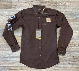 MENS ARIAT TEAM LOGO TWILL FITTED LONG SLEEVE BROWN/BLUE SHIRT | 10058511