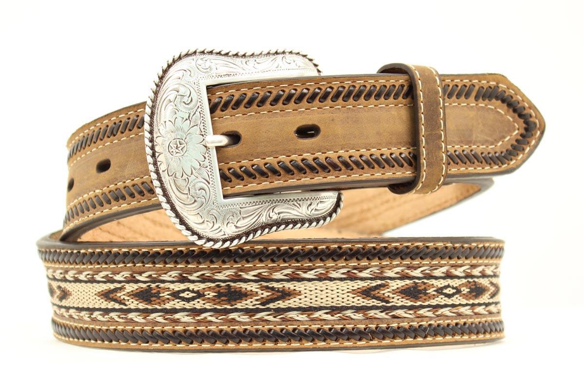 Enjoy comfort and durability from this Mens Nocona belt. This Mossy Oak camo overlay print belt has great detail with a white stitching on the edges. This belt is perfect for your favorite hunter. Interchangeable antique silver buckle.
